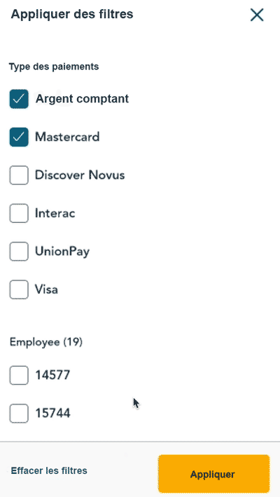 - L’écran « Appliquer des filtres » s’affiche. Appuyez sur une ou plusieurs cases à cocher pour filtrer par type de paiement et/ou employé. Vous pouvez appliquer plusieurs filtres.