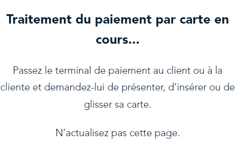 - Comme indiqué sur l’écran, donnez le terminal au client ou à la cliente pour qu’il puisse entrer sa carte de débit. Cette étape est requise lorsque l’achat original a été effectué en utilisant une carte de débit. Lors d’un remboursement, l’argent est toujours retourné au moyen du mode de paiement utilisé lors de l’achat.