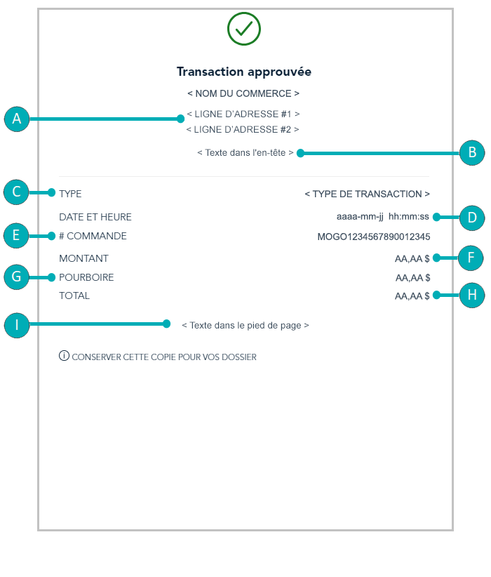 L’image avec les lettres ci-dessous est un exemple générique d’un reçu de transaction en argent comptant dans le portail Moneris Go.