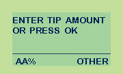The cardholder will be prompted to enter the Tip as a percentage value or as a dollar amount. (The cardholder may press OK to bypass entering a Tip during one of the following prompts.) |