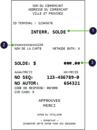 Nota : Lorsque vous effectuez une interrogation du solde d’une carte, seule la copie du reçu du client s’imprime, et ce, même si vous avez configuré le terminal de manière à ce que plusieurs copies des reçus s’impriment.