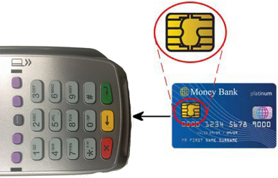 Le lecteur de carte à puce est situé dans la fente qui se trouve sur le devant du terminal. Quand une carte à puce y est insérée, le lecteur lit les données enregistrées dans la puce (p. ex., pour savoir si le client doit entrer son NIP ou signer le reçu).