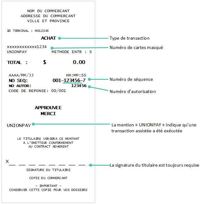 Nota : Pour toutes les transactions UnionPay où le titulaire de carte est présent (débit ou crédit), le titulaire de carte doit signer la copie du commerçant, même s'il a saisi son NIP.