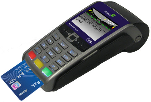The chip card reader is located in a slot in the front of the terminal. When a chip card is inserted, the chip card reader reads the information on the card's chip (e.g., whether to prompt for PIN or print a signature line on the receipt).