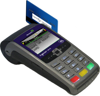 The magnetic stripe reader (MSR) is located in a slot on the right-hand side of the terminal. When a payment card is swiped, the MSR reads the information encoded on the card's black magnetic stripe.