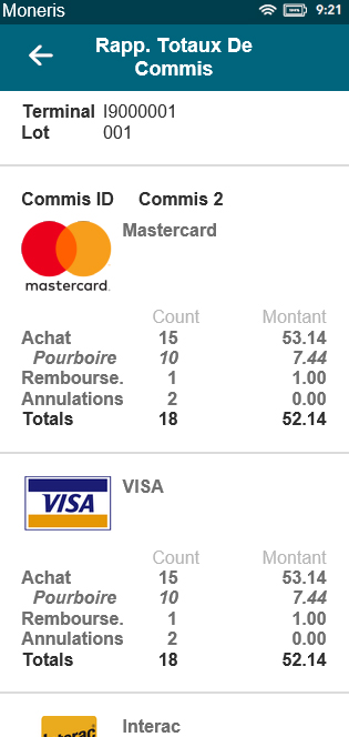 Créez ce rapport pour consulter les totaux des transactions du lot actuel ou d’une date définie. Les totaux sont affichés par marque de carte, y compris les pourboires, avec un total global marqué à la fin.