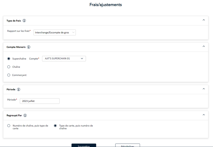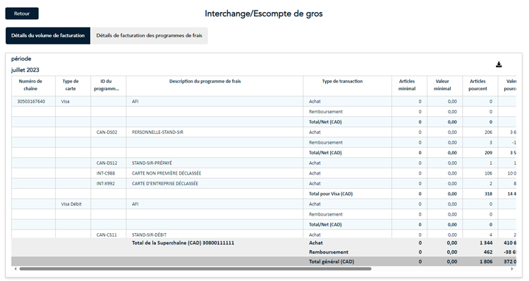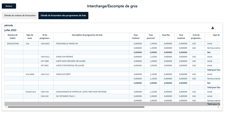 Consultez le site https://www.moneris.com/fr-ca/a-propos-moneris/code-de-conduite/taux-dinterchange pour en savoir plus sur les frais d’interchange et d’escompte de gros prévus par les marques de carte que vous acceptez. Ce rapport peut être exécuté au niveau du commerçant ou de la commerçante, de la chaîne ou de la superchaîne. Il comprend deux types de renseignements : les détails du volume de facturation et les détails du programme de frais de facturation. Ces deux types de renseignements sont décrits dans les sections ci-dessous.