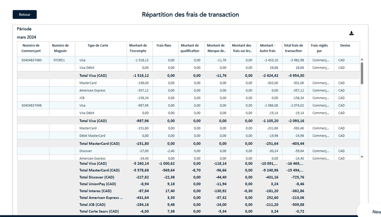 - Le total des frais de transaction pour chaque type de carte par propriétaire de commerce.