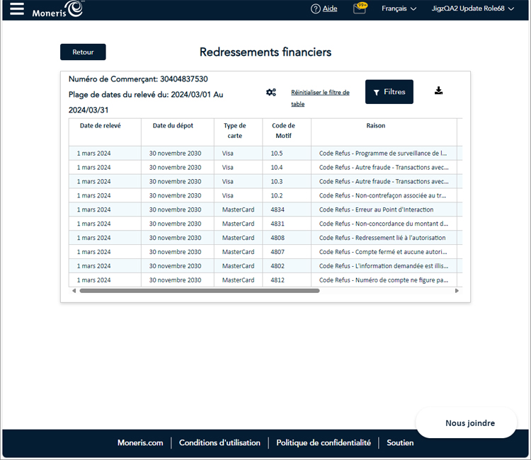 Le rapport Redressements financiers vous permet de consulter les ajustements financiers effectués par Moneris, y compris les rétrofacturations et les ajustements manuels. Le relevé indique les ajustements financiers effectués au cours du mois écoulé au niveau de la ou du propriétaire de commerce ou chaîne.
