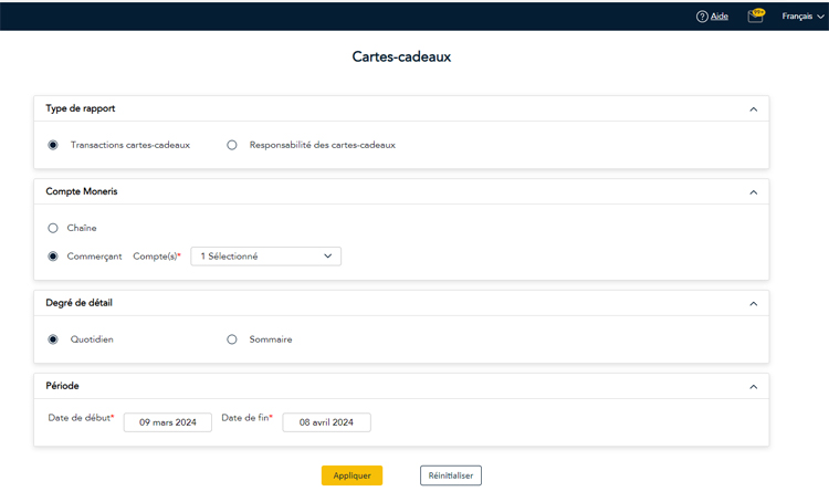 - Montant cartes expirées : Ce champ affiche le montant total en dollar restant sur les cartes-cadeaux Moneris qui ont expiré au cours du mois sélectionné.
