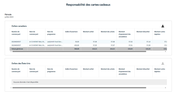 Le rapport sur les dettes liées aux cartes-cadeaux affiche les cartes-cadeaux activées, mais non utilisées au niveau du commerçant ou de la chaîne pour un mois donné. Les données sont détaillées et affichées en dollars canadiens et des États-Unis.