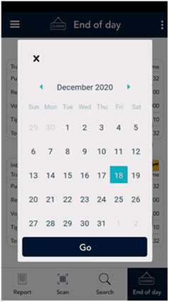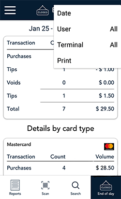 - End of day: Tap End of day to view the End of day report which shows transaction totals since the Report reset time, followed by totals for