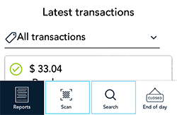 - Scan or Search: Use either of these functions to find a transaction. Tap Scan to use the terminal’s rear camera to scan the QR code on a receipt.