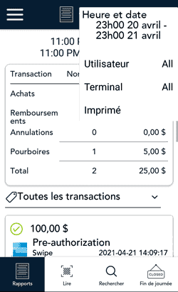 Seuls les transactions ou les totaux des transactions qui correspondent aux filtres d'heure et de date indiqués’affichent à l’écran.