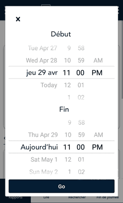 - Pour modifier la date, appuyez sur le champ Date, selectionnez une nouvelle date et heure de "Debut" et une nouvelle date et heure de "Fin" (au besoin), puis appuyez sur Go.