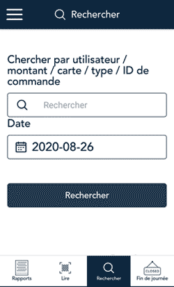 du terminal pour lire le code QR d’un reçu. Appuyez sur Rechercher afin d’entrer des critères de recherche précis. Pour connaître la façon d’utiliser les fonctions Lire ou Rechercher, consultez la section Trouver une transaction en utilisant Lire ou Rechercher.