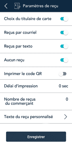 Remarque : Si vous désactivez le paramètre « Choix du titulaire de carte », l'application imprimera automatiquement un reçu du client.