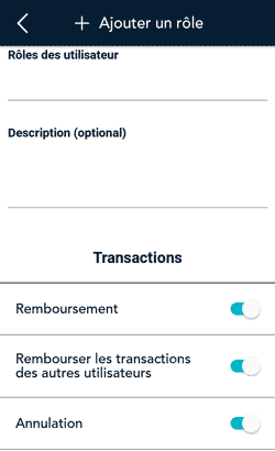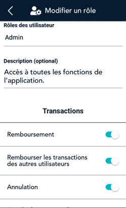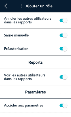 - Pour les transactions, les rapports et les paramètres, appuyez sur la bascule correspondante