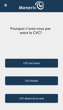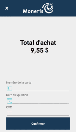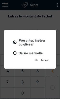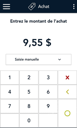 Remarque : L’ordre de ces étapes initiales est flexible. Vous pouvez entrer le montant de l’achat en premier, ou vous pouvez choisir la méthode de saisie de la carte en premier. Les deux vont marcher. |