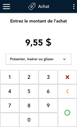 - Commencez à l’écran Achat. Il s’agit de l’écran par défaut du terminal.