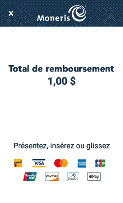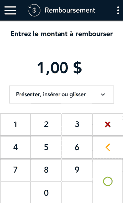 - L’écran du total du remboursement s’affiche et demande au client de « Présenter, insérer ou glisser » sa carte.