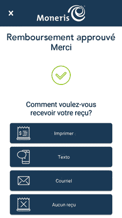 - Une fois le remboursement approuvé, l’invite « Comment voulez-vous recevoir votre reçu? » s’affiche et présente les options d’envoi du reçu suivantes : Imprimer, Texto, Courriel, et Aucun.