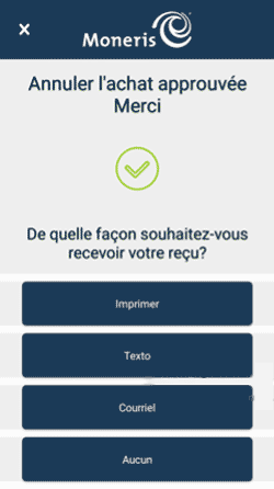- Une fois l’annulation approuvée, l’invite « De quelle façon souhaitez-vous recevoir votre reçu? » s’affiche et présente les options d’envoi du reçu suivantes : Imprimer, Texto, Courriel, et