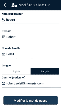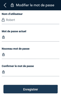 4. À l’écran « Modifier le mot de passe » : a. Entrez les renseignements requis dans chacun des champs. Vous aurez besoin de votre mot de passe actuel. Si vous avez oublié votre mot de passe actuel, consultez la section Vous avez oublié votre mot de passe? . Un utilisateur avec un rôle Admin peut également modifier votre mot de passe sans connaître votre mot de passe actuel. Consultez la section Utilisateurs . b. Appuyez sur Enregistrer. L’application retourne à l’écran Modifier l’utilisateur. c. Appuyez sur Enregistrer. Vous retournerez au menu principal.  |