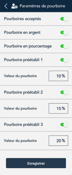 l'icône  2. Dans le menu Paramètres, appuyez sur Pourboire. L'écran « Paramètres des pourboires » s'affiche. Pourboires acceptés : Activez cette option pour que l’invite de pourboire s’affiche lorsque les clients paient. Une fois cette option activée, les différents pourboires acceptés s’afficheront. Pourboire en argent : Activez cette option pour que vos clients puissent laisser un pourboire comme montant précis. Pourboire en pourcentage : Activez cette option pour que vos clients puissent laisser un pourboire qui correspond à un pourcentage du montant total. Pourboire préétabli 1 : Activez cette option pour que vos clients puissent laisser un pourboire correspondant à un pourcentage préétabli. Appuyez sur le champ de valeur préétablie et entrez un pourcentage (p. ex. 15), puis appuyez sur le crochet. Pourboire préétabli 2 : Activez cette option pour que vos clients puissent laisser un pourboire correspondant à un pourcentage préétabli. Appuyez sur le champ de valeur préétablie et entrez le pourcentage choisi (p. ex. 20). Appuyez sur le crochet. Pourboire préétabli 3 : Activez cette option pour que vos clients puissent laisser un pourboire correspondant à un pourcentage préétabli. Appuyez sur le champ de valeur préétablie et entrez le pourcentage choisi (p. ex. 25). Appuyez sur le crochet. 3. Lorsque vous avez terminé de modifier les paramètres de pourboire, appuyez sur Enregistrer. Vous retournerez au menu Paramètres. 4.      Pour