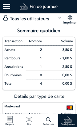 de carte (Détails par type de carte). IMPORTANT! Votre rôle d’utilisateur détermine les transactions qui sont incluses dans ce rapport. Pour les rôles d’utilisateur dont la fonction « Voir les autres utilisateurs dans les rapports » est activée, l’utilisateur verra par défaut l’option « Tous les utilisateurs » dans le champ de l’utilisateur à l’écran Fin de journée. Si cette fonction est désactivée, le nom de l’utilisateur s’affichera dans le champ de l’utilisateur, et seules les transactions de cet utilisateur s’afficheront. Consultez la section Rôles des utilisateurs. c. Choisissez une action : § Au besoin, appuyez sur le champ de l’utilisateur et sélectionnez « Tous les utilisateurs » afin de consulter les transactions traitées par tous les utilisateurs. § Appuyez sur l’icône Imprimer pour imprimer le rapport, y compris le sommaire et les « Détails par type de carte ». § Appuyez sur l’icône Précédent < dans la barre de titre pour revenir à l’écran Rapports.  |