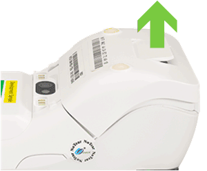 1. Placez le terminal, face vers le bas, sur une surface plane, propre et sèche. 2. Soulevez le loquet de l’imprimante et tirez-le vers le haut pour ouvrir le couvercle du compartiment de logement du papier.  |