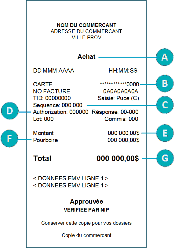Ces exemples de reçu vous aident à repérer le numéro d’autorisation (pour le remboursement) ou le numéro de séquence (pour l’annulation et la conclusion).