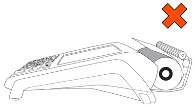 2. Insert the paper roll into the paper well with the loose end unrolling from the top of the roll toward the back of the terminal. Note: If the paper is installed backward, your printouts will be blank. 3. Unroll enough paper to extend at least one inch (2.5 cm) past the back of the terminal. |