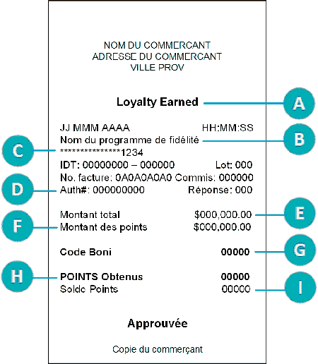 Un numéro d’autorisation s’affiche sur la copie du reçu du client et celle du commerçant pour chaque transaction par carte de fidélité. Vous pourriez être invité à saisir ce numéro lorsque vous traitez des remboursements et des annulations par carte de fidélité ainsi que lorsque vous réimprimez les reçus de transaction.