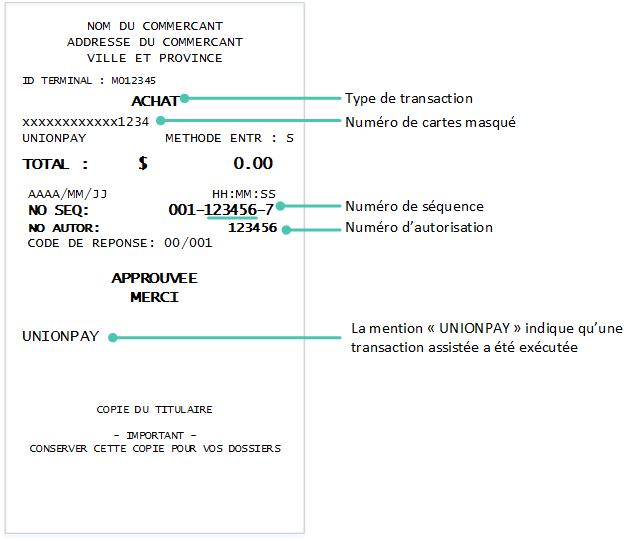 Nota : Pour toutes les transactions UnionPay où le titulaire de carte est présent (débit ou crédit), le titulaire de carte doit signer la copie du commerçant, même s'il a saisi son NIP.