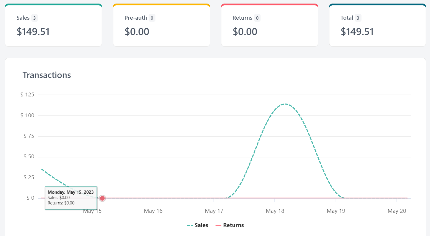 For the date range selected, the dashboard shows dollar values for transactions like sales (purchases) and returns. Those values are also presented as a graph. Hover your mouse on any data point on the graph to see a summary for that day.
