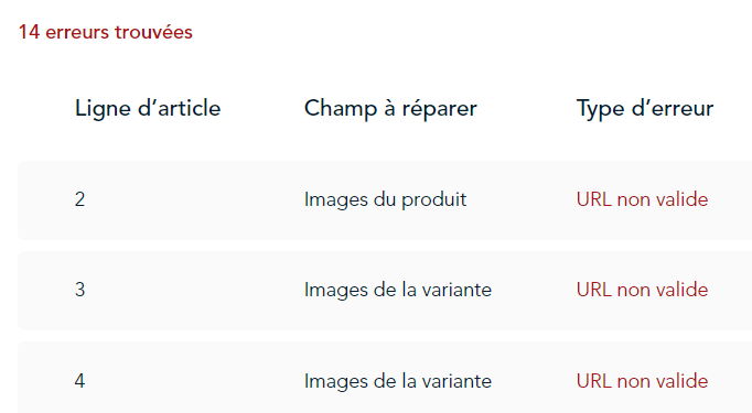 - L’application affiche les erreurs trouvées dans les données du produit, ainsi que le numéro de ligne de la feuille de calcul, le champ à réparer et le type d’erreur.