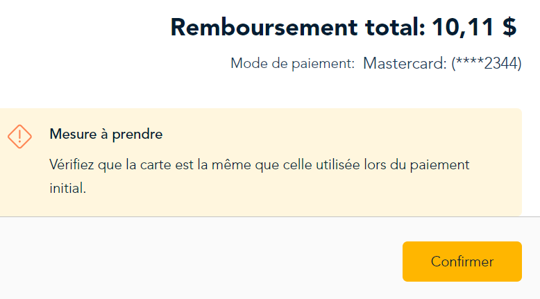 - Si une carte de débit ou de crédit a été utilisée lors de l’achat original, vérifiez que la carte utilisée pour le remboursement est la même carte que celle utilisée lors de l’achat. Lors d’un remboursement, l’argent est toujours retourné au moyen du mode de paiement utilisé lors de l’achat.