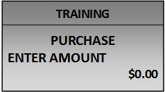 The TRAINING Ready screen displays "TRAINING" (instead of "READY") over the default transaction (Purchase or Pre-Auth). This screen appears when the terminal is in Training mode.