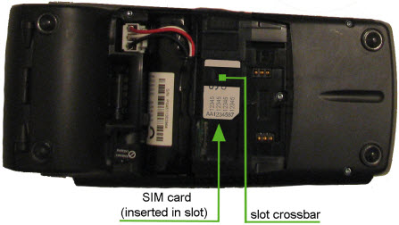 4.  Locate the SIM slot on the terminal, and properly position the SIM card for insertion with the  mobile services provider brand label facing up (as pictured below).