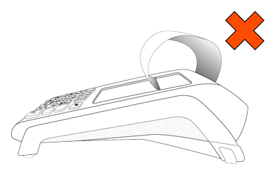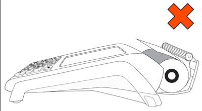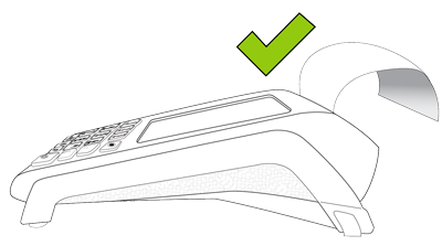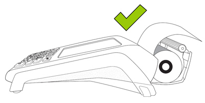 2. Insert the paper roll into the paper well with the loose end unrolling from the top of the roll toward the back of the terminal. Note: If the paper is installed backward, your printouts will be blank. 3. Unroll enough paper to extend at least one inch (2.5 cm) past the back of the terminal. |