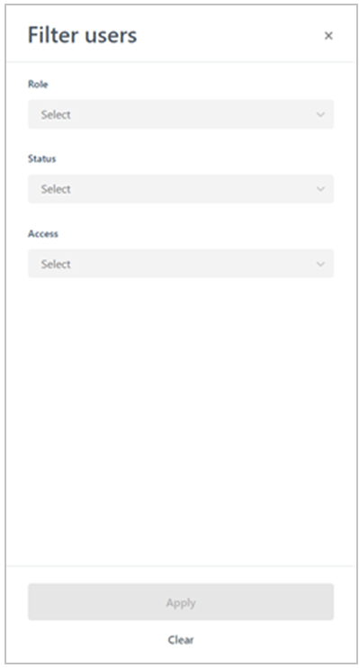 When the "Filter users" window displays (shown below), click on one or more of the desired filter drop-downs (Role, Status, and/or Access).