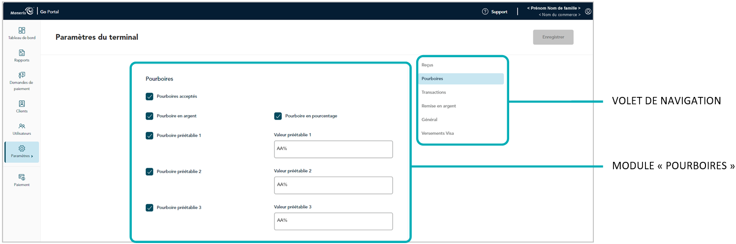Les étapes ci-dessous expliquent comment modifier les paramètres du pourboire sur tous les terminaux synchronisés avec votre commerce du portail Moneris Go.