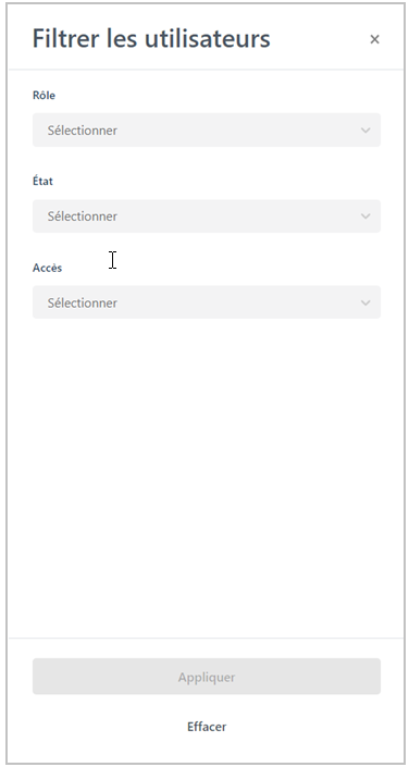 Lorsque la fenêtre « Filtrer les utilisateurs » s’affiche (illustrée ci-dessous),cliquez sur un ou plusieurs des menus déroulants de filtres désirés (Rôle, État ou Accès).