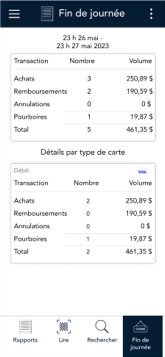 Le rapport de fin de journée affiche les totaux des transactions depuis l’heure de réinitialisation des rapports. Le montant total du pourboire s’affiche également si vous avez activé cette fonction. Consultez la section Paramètres pour en savoir plus.