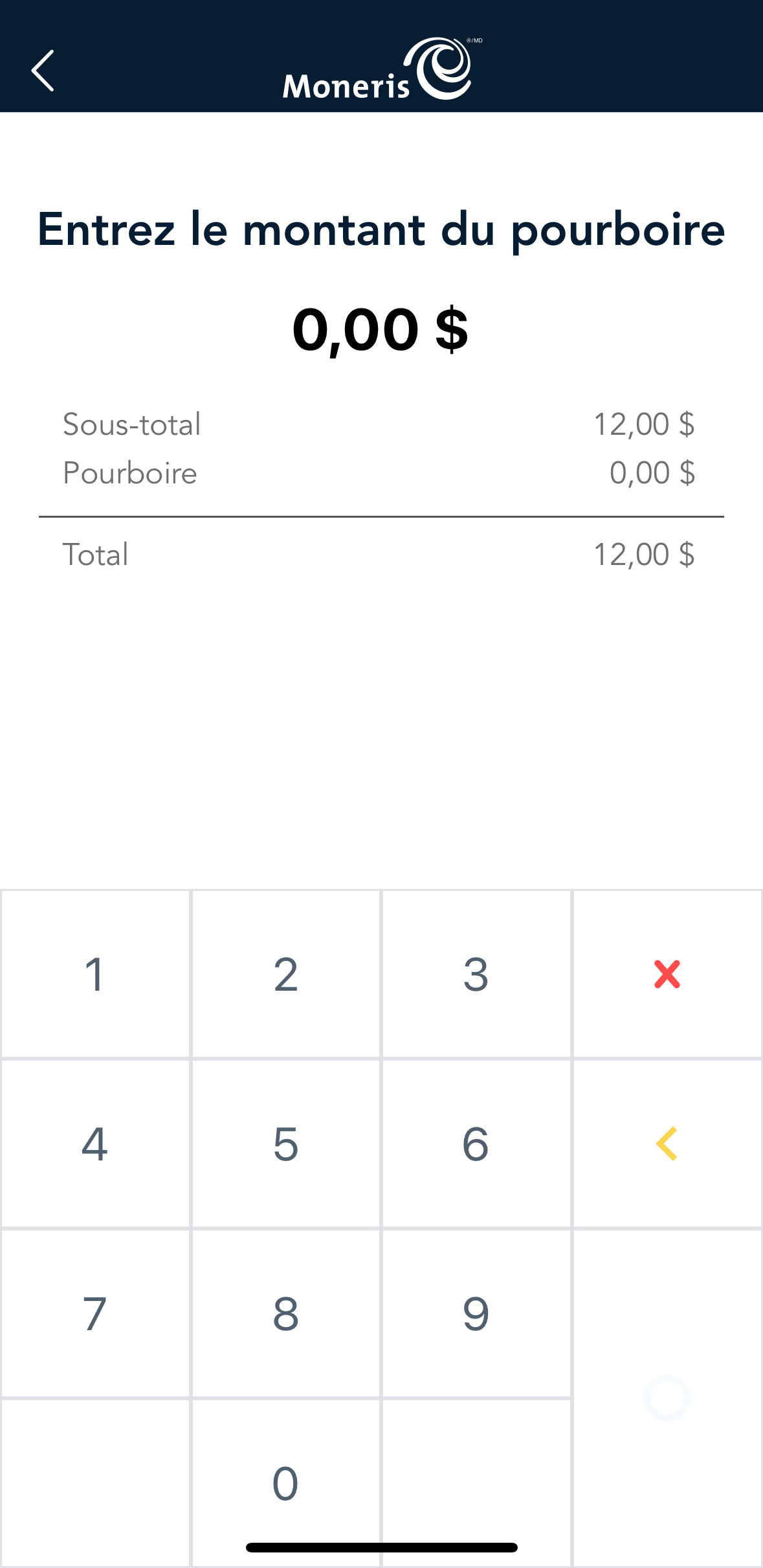 L’écran affiche le montant total de l’achat incluant le pourboire.